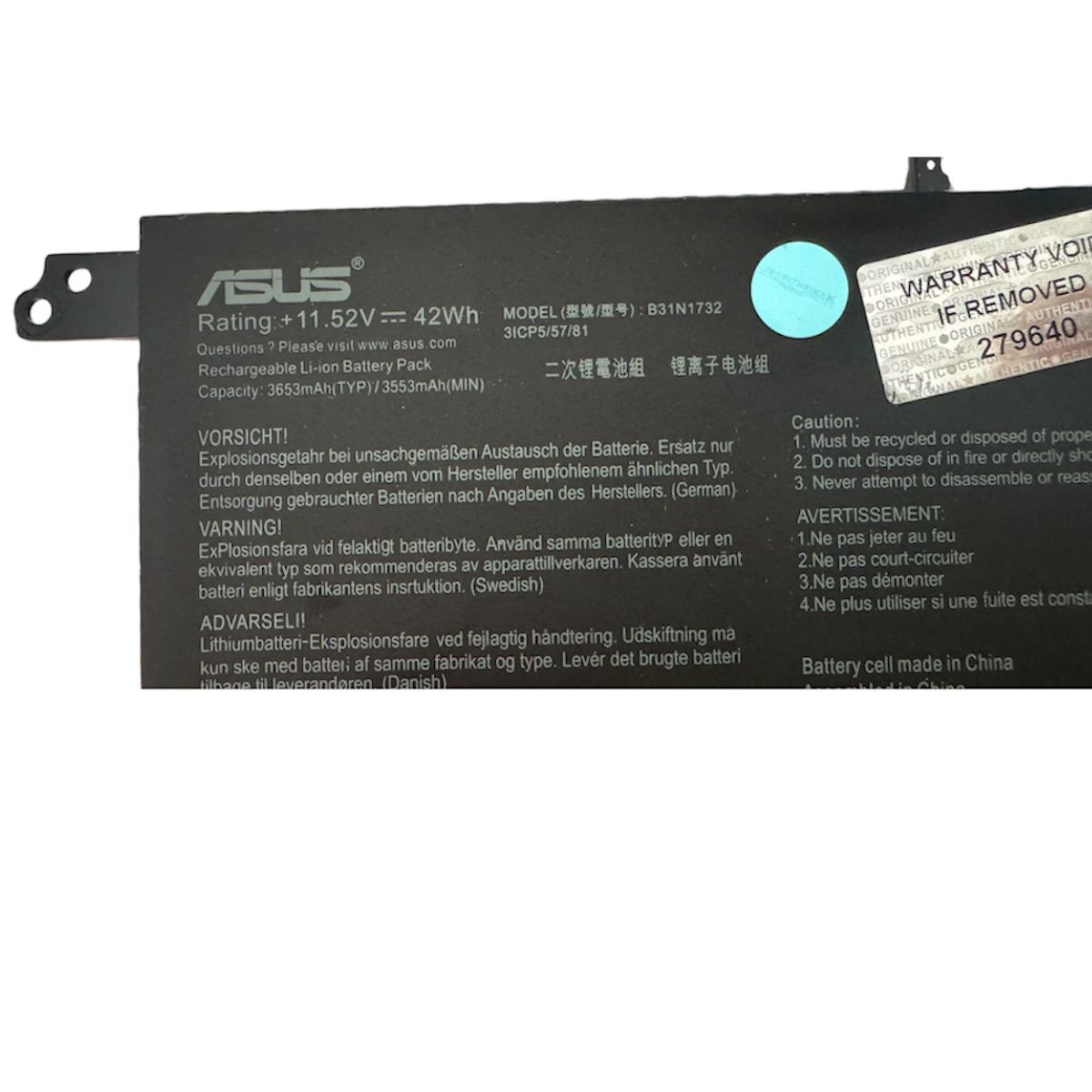 Batería Original ASUS B31N1732 de 11.52V y 42Wh para VivoBook S14 (S430FA/FN/UA/UF/UN), X430, K430, R430, V430 y F571. Ion de litio 3 celdas con protecciones integradas. Hasta 500 ciclos de recarga. Certificada CE/RoHS/FCC. Garantía 12 meses. Compatible con números de parte: B31Bi9H, 0B200-02960000, 0B200-02960400.