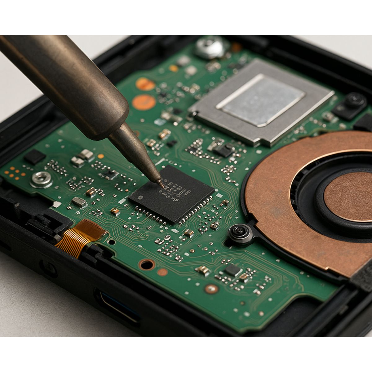 - Desmontaje y microsoldadura del chip IC video dañado