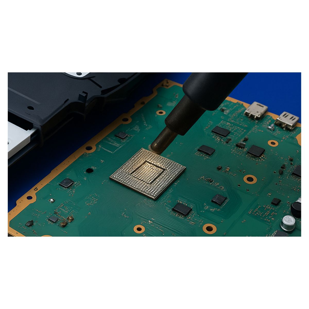 ¿Tu PS5 no enciende, se apaga sola o presenta errores gráficos? En nuestro servicio especializado de Reballing APU para PlayStation 5 realizamos un procedimiento técnico avanzado que restaura las conexiones del chip APU (Accelerated Processing Unit) mediante soldadura con estaño de alta calidad en estación de calor por infrarrojo.